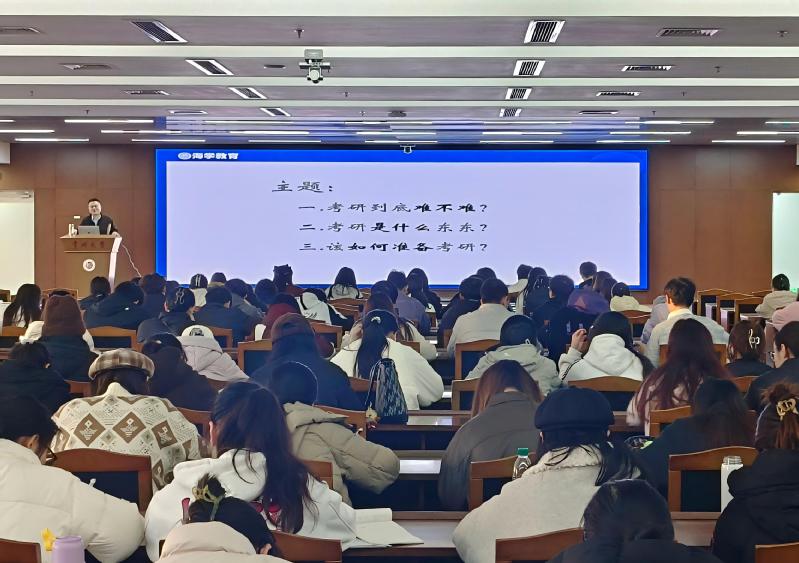 讲座围绕升学必要性、考研难度分析、考研基本情况、择校择专策略及备考方法等方面展开。主讲人指出,国内就业市场对硕士学历需求持续增长,升学路径呈现多元化趋势;面对考研竞争压力,勤奋是基本要求,顶层的报考方案设计是关键,科学合理的备考安排是核心,充足的学习时间是保证。同时,主讲人系统解析了学硕与专硕、全日制与非全日制等类型差异,并为同学们明确了政治、英语、数学及专业课的备考要点。