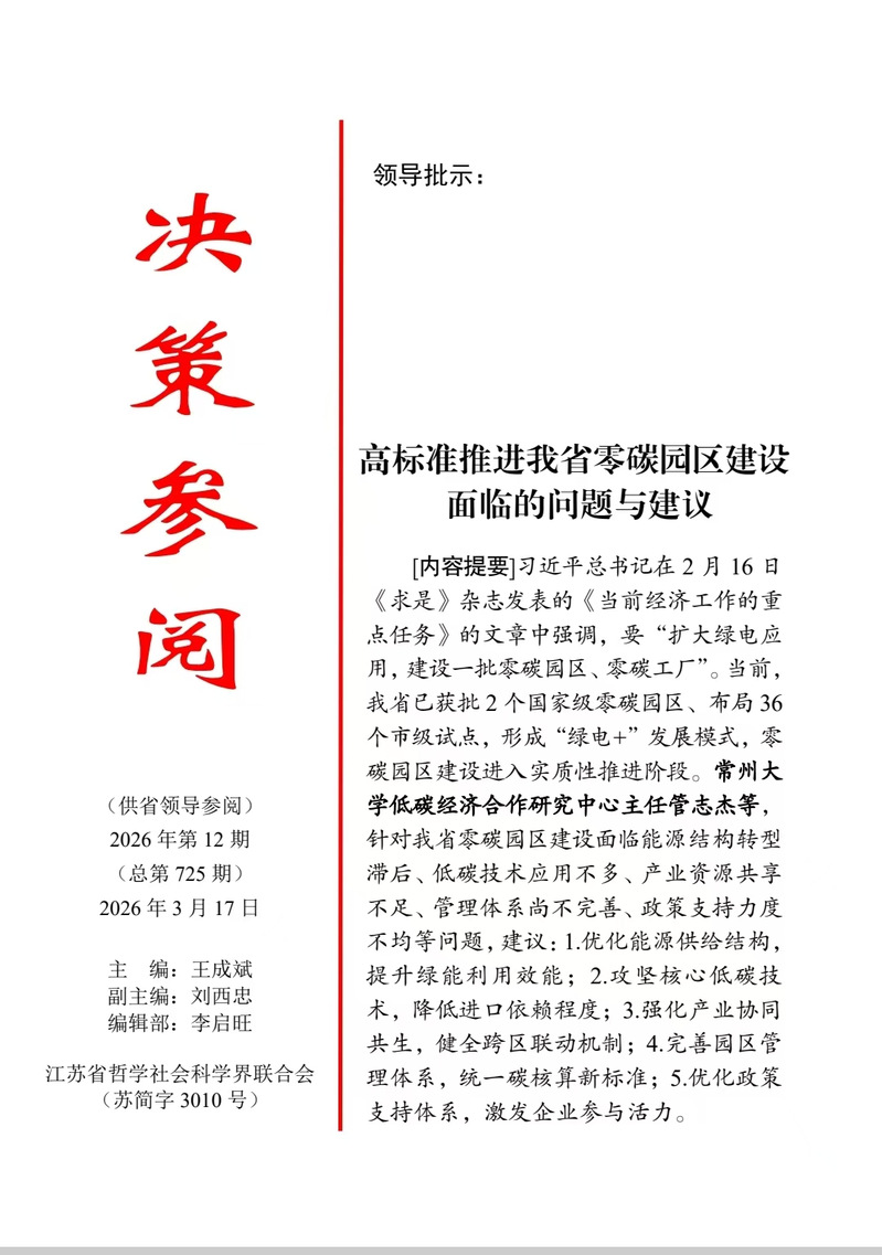 近日,斗球体育 管志杰教授与国贸242班王博涵撰写的决策咨询报告《高标准推进我省零碳园区建设面临的问题与建议》在江苏省哲学社会科学界联合会内刊《决策参阅》2026年第12期发表,并获江苏副省级领导肯定性批示。